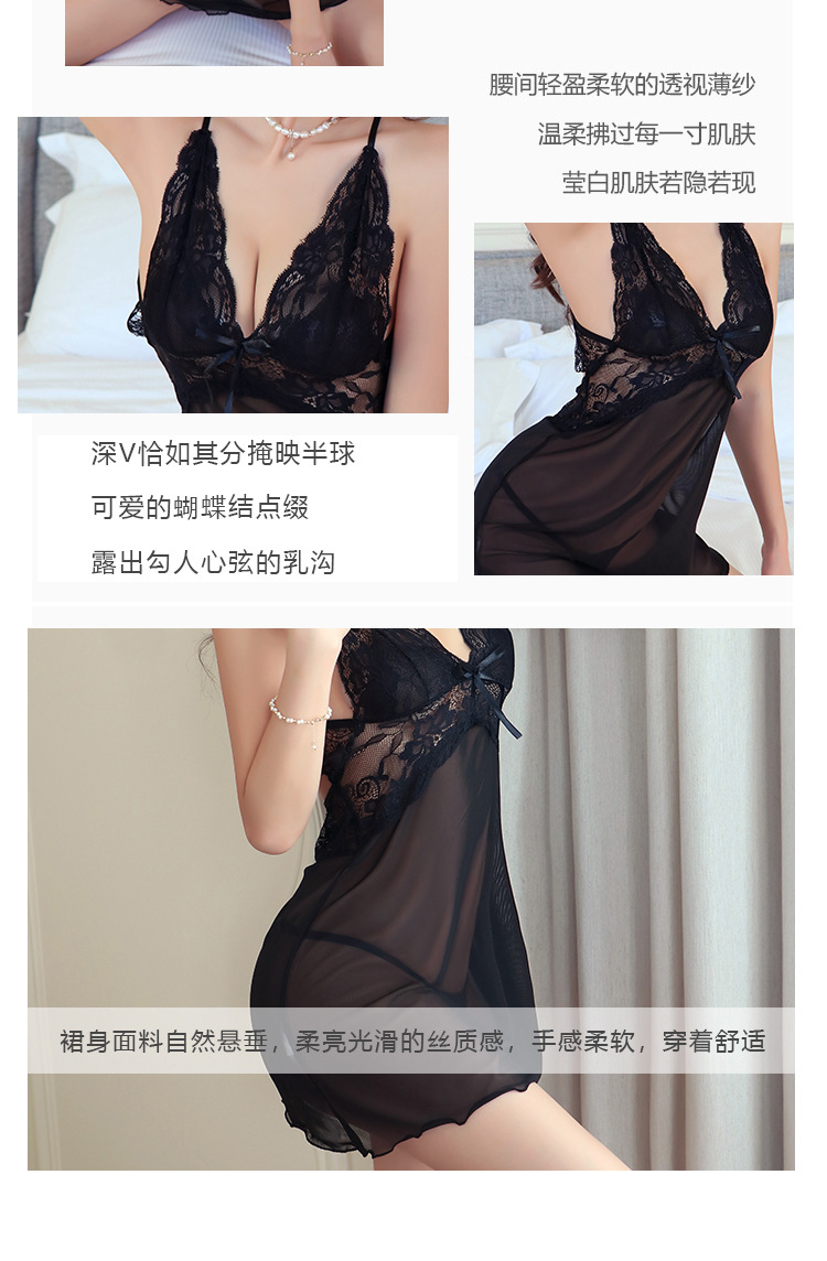 性感吊带镂空蕾丝睡裙 光滑冰丝 透视薄纱